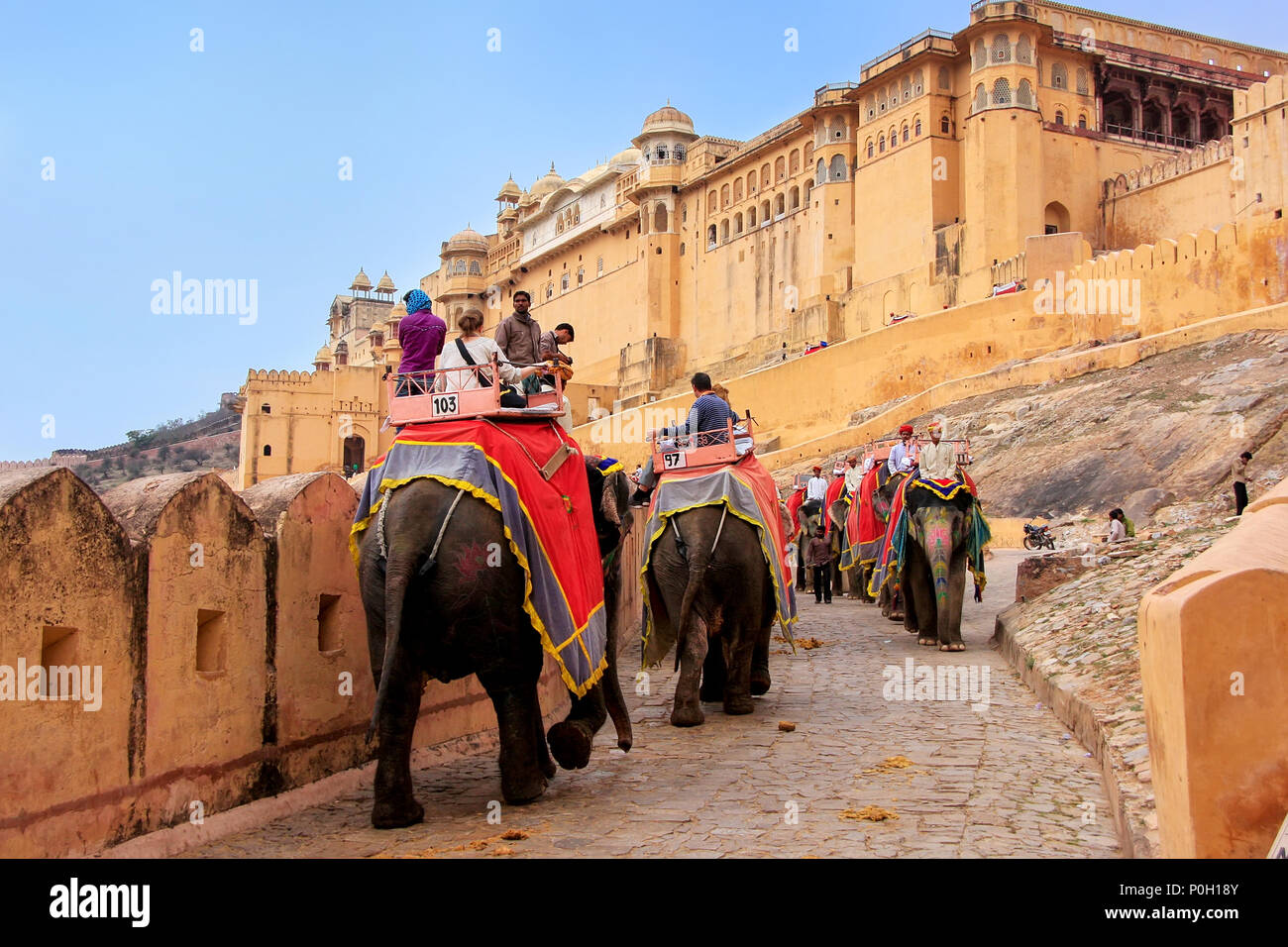 Decorated Elephants Going On The Cobblestone Path To Amber