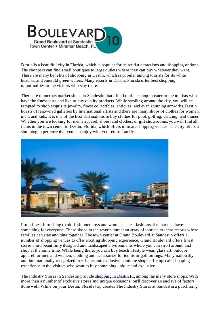 Its a great place to relax and unwind by the water fish or play a round of golf at one of the award winning courses in the area on your weekend getaway or day tripeasily accessed thanks to the northwest florida regional airport. It will be worth it. Dont rush to see all of the attractions in destin on your first trip itself.